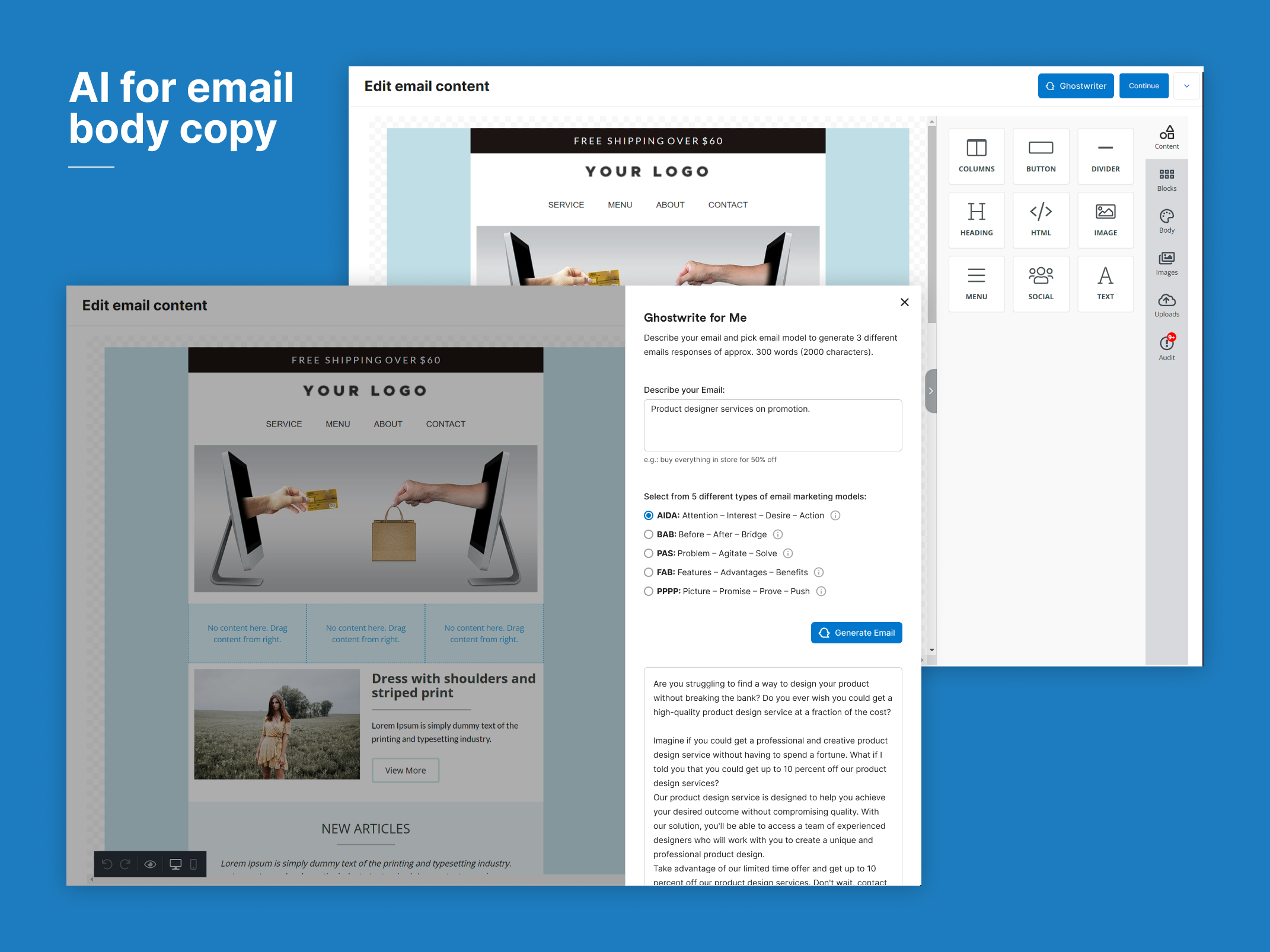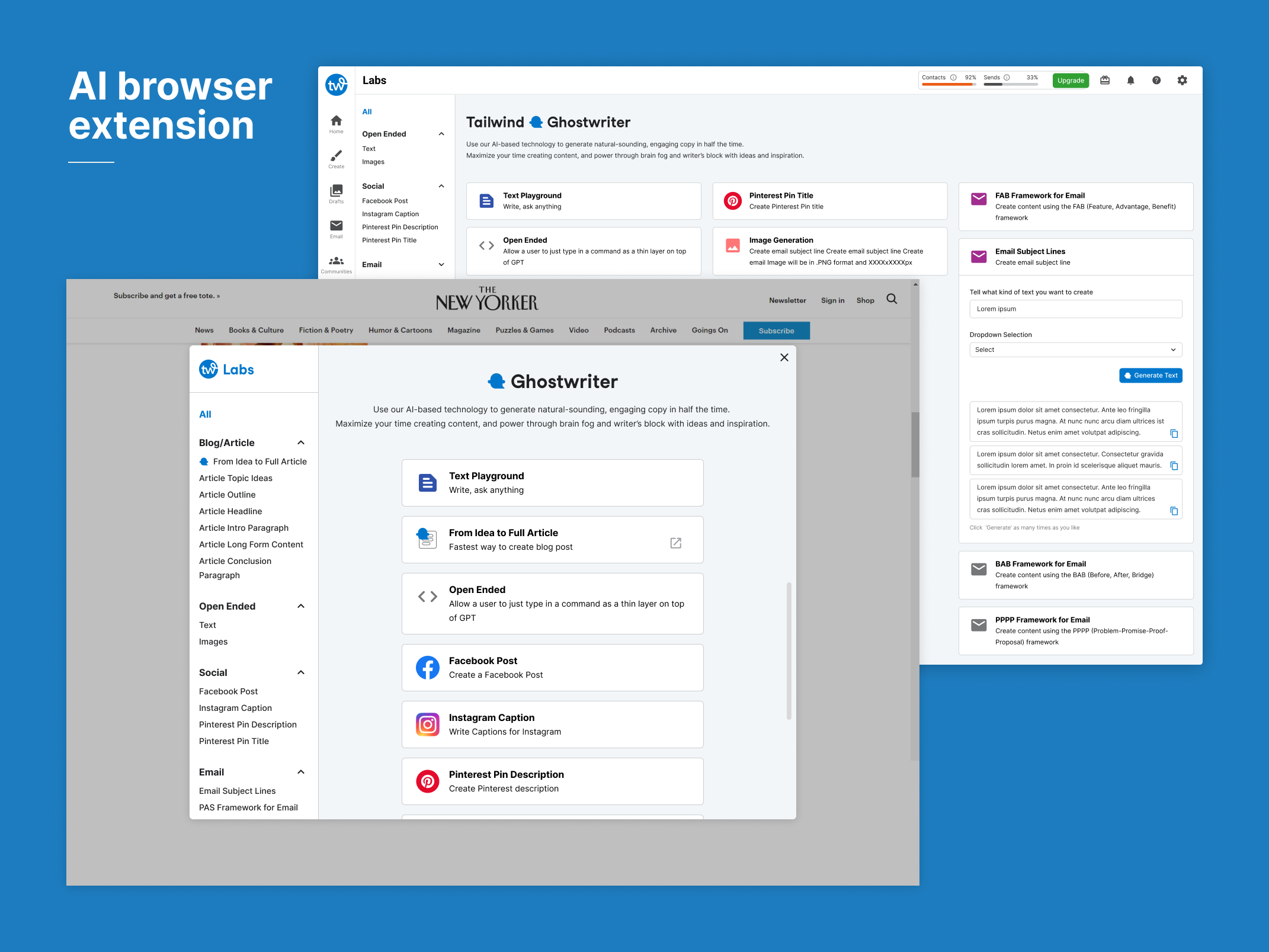 Our team embarked on an exciting journey to explore the potential of artificial intelligence (AI) through cutting-edge technology called "GhostWriter." With the objective of improving user experience and social media campaign effectiveness, we aimed to address key challenges faced by email marketers and provide them with intuitive features and functionalities. Through this project, we aimed to position Tailwind Email as a leading solution in the competitive email marketing industry.